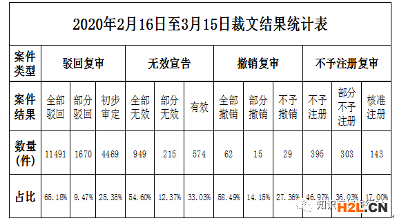 2020年2月16日至3月15日,審理簽發(fā)各類評審案件21155件,同比減少10.24%,其中簽發(fā)駁回復審案件18324件,同比減少4.46%,簽發(fā)復雜案件2831件 ,同比減少35.50%,按換算工作量計算,同比減少24.53%。