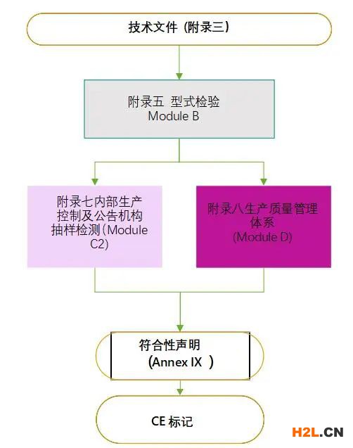 按照PPE法規(guī)要求,個人防護口罩需要有公告機構(gòu)審核發(fā)放的CE證書,才能在歐盟合法上市銷售。根據(jù)PPE法規(guī)關(guān)于符合性的相關(guān)規(guī)定,制造商需要建立相應(yīng)技術(shù)文件,并滿足EN149:2001+A1:2009的規(guī)格和測試要求。和醫(yī)用口罩相比,個人防護口罩至少需獲得兩張公告機構(gòu)的證書,即按照附錄五的型式檢驗證書,按照附錄七(Module C2)的證書或者附錄八(Module D)的證書,詳見下圖: