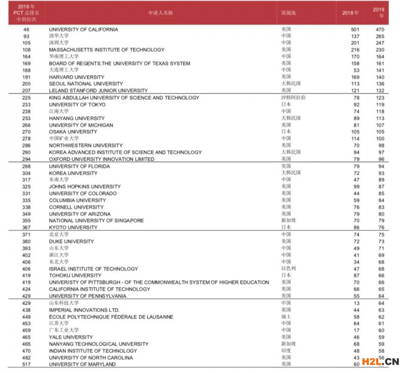 此外,數(shù)據(jù)顯示,按照PCT國際專利申請人的分類,中國企業(yè)和高校的表現(xiàn)十分搶眼。2019年,中國的華為技術(shù)有限公司以4411件PCT國際專利申請排名第一。位居其后的是日本三菱電機株式會社(2661件)、韓國三星電子(2334件)、美國高通公司(2127件)和中國廣東歐珀移動通信有限公司(1927件),排名前十的企業(yè)申請人中包括4家中國企業(yè)。在高校方面,加利福尼亞大學(xué)以470件國際專利申請蟬聯(lián)第一,清華大學(xué)(265件)位列第二,之后是深圳大學(xué)(247件)、麻省理工學(xué)院(230件)和華南理工大學(xué)(164件)。排名前十的高校中,有5所來自美國,4所來自中國,1所來自韓國。
