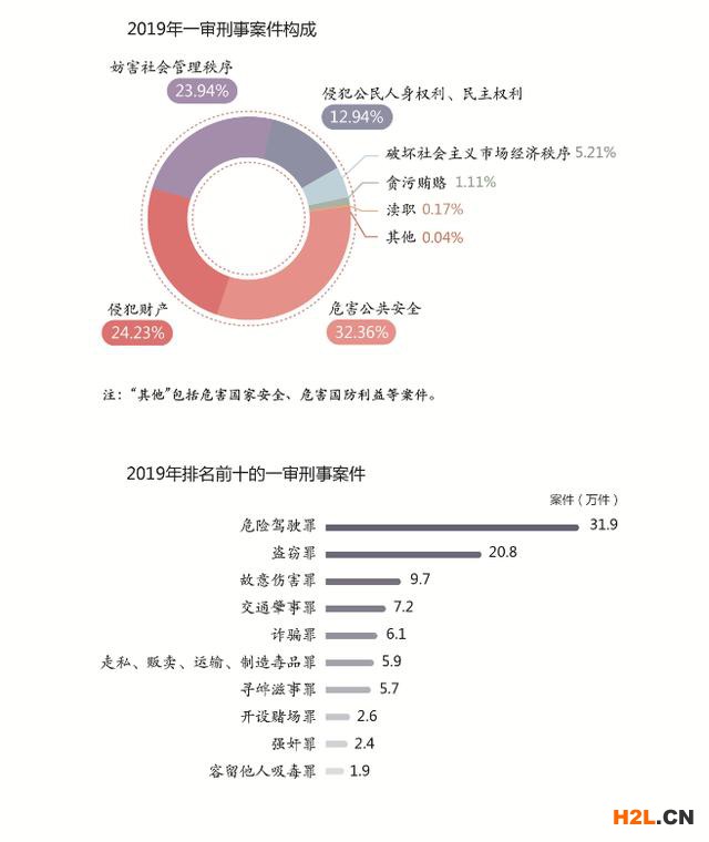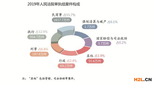1.審結(jié)、執(zhí)結(jié)2902.2萬件:指地方各級人民法院2019年審結(jié)、執(zhí)結(jié)各類案件總數(shù)。其中,審結(jié)刑事案件1975511件,占6.81%;民商事案件16177373件,占55.74%;行政案件692034件,占2.38%;國家賠償與司法救助案件57377件,占0.20%;執(zhí)結(jié)執(zhí)行案件9546952件,占32.90%;強制清算與破產(chǎn)案件17399件,占0.06%;其他案件555710件,占1.91%。報告中的案件數(shù)據(jù),未經(jīng)特別說明的,均為一審結(jié)案數(shù)據(jù)。報告中反映的各項工作,包括最高人民法院和地方各級人民法院工作。