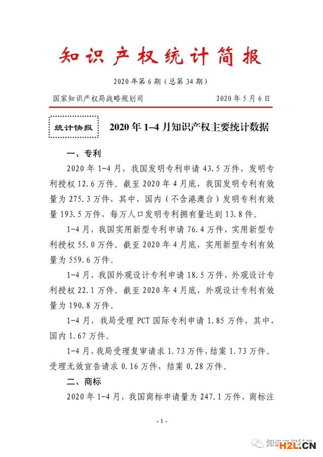 國(guó)知局:2020年1-4月商標(biāo)、專利、地理標(biāo)志等知識(shí)產(chǎn)權(quán)主要數(shù)據(jù)