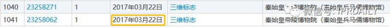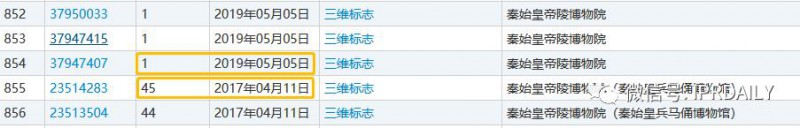 結(jié)果顯示共有1041件三維標(biāo)志,也就是商標(biāo)中較為獨特的一種立體商標(biāo)。申請時間跨度為2017年3月22日—2019年6月18日。兩年的時間里,秦始皇帝陵博物院一共為其所擁有的兵馬俑申請了一千多件商標(biāo)!