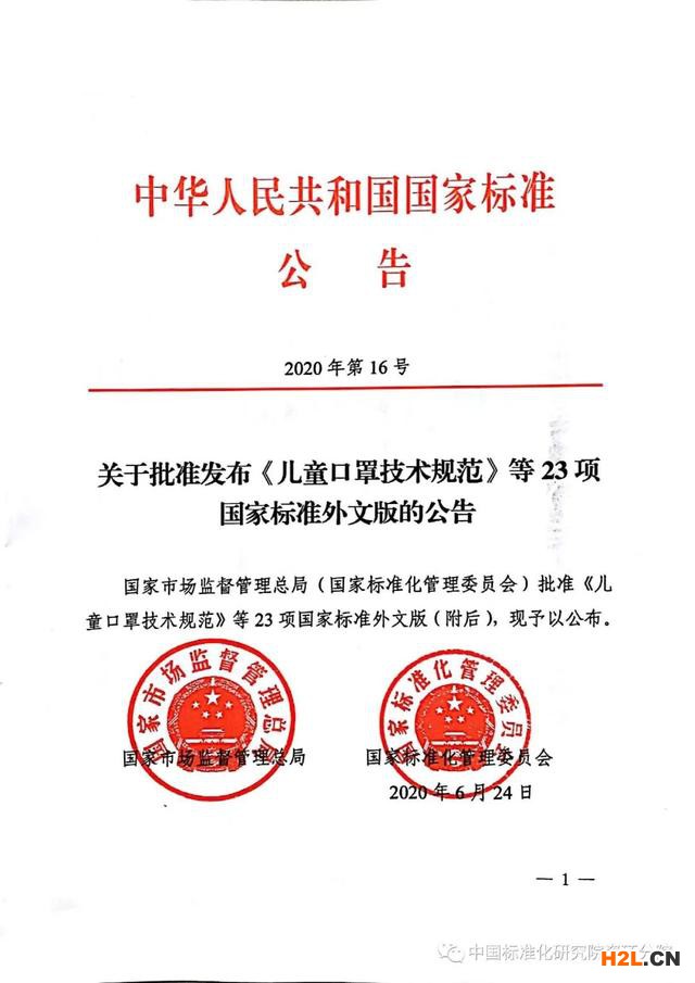 核心提示:2020年6月24日,國家市場監(jiān)督管理總局(標(biāo)準(zhǔn)化管理委員會)批準(zhǔn)發(fā)布了《兒童口罩技術(shù)規(guī)范》等23項國家標(biāo)準(zhǔn)外文版(2020年第16號)。其中,