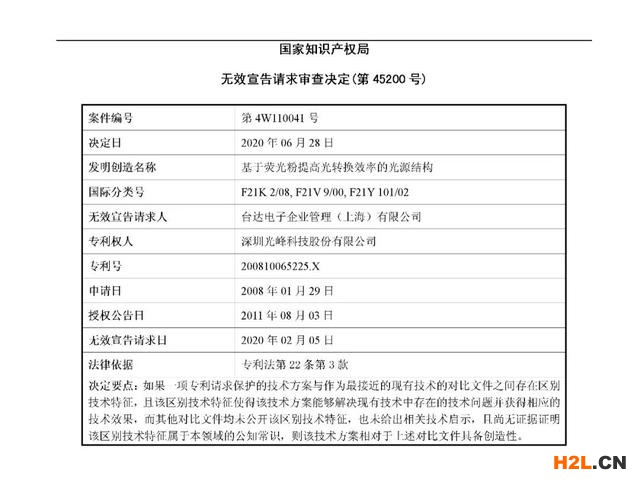 “5225專利”系光峰科技所持有的“基于熒光粉提高光轉(zhuǎn)換效率的光源結(jié)構(gòu)”專利(專利號:200810065225.X)。近期國家知識產(chǎn)權(quán)局出具的三份《無效宣告請求審查決定書》(第45200、45198、45197號)中,國家知識產(chǎn)權(quán)局對臺達(dá)電子企業(yè)管理(上海)有限公司、廣州德浩科視電子科技有限公司以及魏群針對光峰科技“5225專利”分別提出的無效宣告請求進(jìn)行了審查,并作出了維持專利權(quán)有效的三項審查決定。