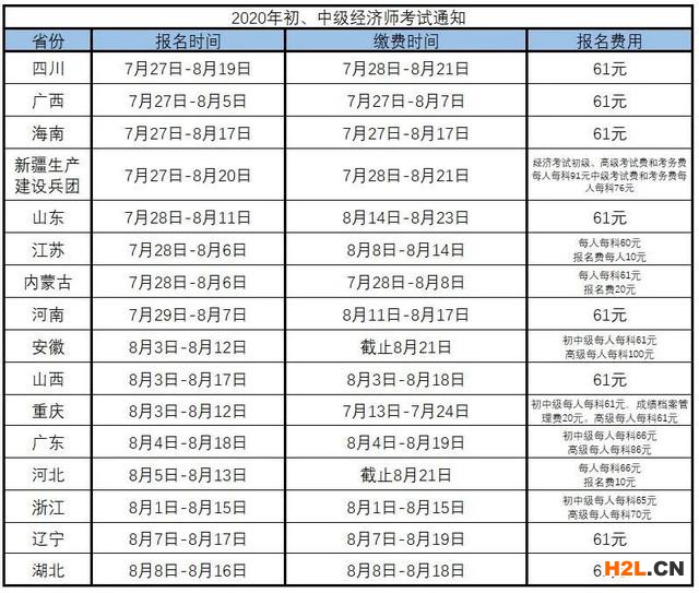 目前已有共16省、市、自治區(qū)公布了2020年經濟師職業(yè)資格考試報名和繳費時間以及報名費用,詳見下列表。