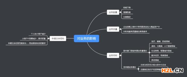 要從四個方面來看:業(yè)務數(shù)量、業(yè)務質(zhì)量、業(yè)務結(jié)構(gòu)以及申請主體結(jié)構(gòu)。1)從業(yè)務數(shù)量來看國內(nèi)絕大多數(shù)的企業(yè)在疫情初期,經(jīng)營活動都產(chǎn)生一定的下降,因此對于研發(fā)的投入就會下降。知識產(chǎn)權(quán)行業(yè)又依托于企業(yè)的發(fā)明創(chuàng)造,那么研發(fā)投入減少,就會一定程度上影響結(jié)果的產(chǎn)出,因此短期內(nèi)業(yè)務量整體會呈現(xiàn)下降趨勢。國知局公布的數(shù)據(jù)顯示,1-2月國內(nèi)發(fā)明申請下降較多。但是三月份又呈現(xiàn)了短暫的恢復。從整體來看處于緩慢的恢復態(tài)勢,長期穩(wěn)定向好。因為國內(nèi)大環(huán)境對于知識產(chǎn)權(quán)的保護越來越重視,度過疫情的艱難期后,創(chuàng)新主體的經(jīng)營會有所恢復,相應業(yè)務量長期應該會處在穩(wěn)定狀態(tài),但是想實現(xiàn)迅猛增長不太現(xiàn)實。2)從業(yè)務質(zhì)量來看創(chuàng)新主體都在降量求質(zhì),因此在IP預算減少的情況下,會優(yōu)先考慮將有限的資金投入至更加精品的產(chǎn)品中,因此會對專利質(zhì)量提升要求。3)從業(yè)務結(jié)構(gòu)來看就國內(nèi)申請業(yè)務來講,某些領(lǐng)域會呈現(xiàn)增長態(tài)勢。經(jīng)過疫情之后,全社會可能會對健康、防疫等方面關(guān)注度更高,因此相應的投入也會更多一些。與生物醫(yī)藥、醫(yī)療器械等有關(guān)的領(lǐng)域會呈現(xiàn)增長態(tài)勢。除了與其直接相關(guān)的領(lǐng)域外,還有一些間接有關(guān)的,比如申請通過大數(shù)據(jù)和人工智能來實現(xiàn)防疫和健康保護的目的等,申請量也會變大。養(yǎng)老領(lǐng)域申請量也會越來越大,因為疫情對老年群體的沖擊較大,未來養(yǎng)老領(lǐng)域的社會關(guān)注度和投入肯定會更多。4)從業(yè)務類型變化來看我們預判的申請總量變化不是很大,但是非申請業(yè)務,質(zhì)押融資等業(yè)務將出現(xiàn)增長。一些受到經(jīng)營現(xiàn)金流影響或經(jīng)濟方面壓力較大的中小企業(yè),可能更多地需要使用知識產(chǎn)權(quán)實現(xiàn)經(jīng)濟效益,因此可能會增加一些與知識產(chǎn)權(quán)變現(xiàn)相關(guān)的業(yè)務。5)從申請主體結(jié)構(gòu)來看客戶結(jié)構(gòu)會隨著服務機構(gòu)規(guī)模和服務主要群體的不同而發(fā)生不同的變化。如果是專業(yè)所,服務客戶固定,如果其未受到太大的疫情影響或比較穩(wěn)定,則客戶結(jié)構(gòu)不會發(fā)生太大變化。如果服務客戶相對規(guī)模小,隨著疫情對企業(yè)生產(chǎn)經(jīng)營的影響,小客戶和個人客戶在這方面的需求都會變小,客戶結(jié)構(gòu)從而產(chǎn)生較大影響。對于綜合所來講,大客戶不會受到很大影響,但他們的IP預算可能會減少,會對服務機構(gòu)的服務水平和能力都有了更高的要求。