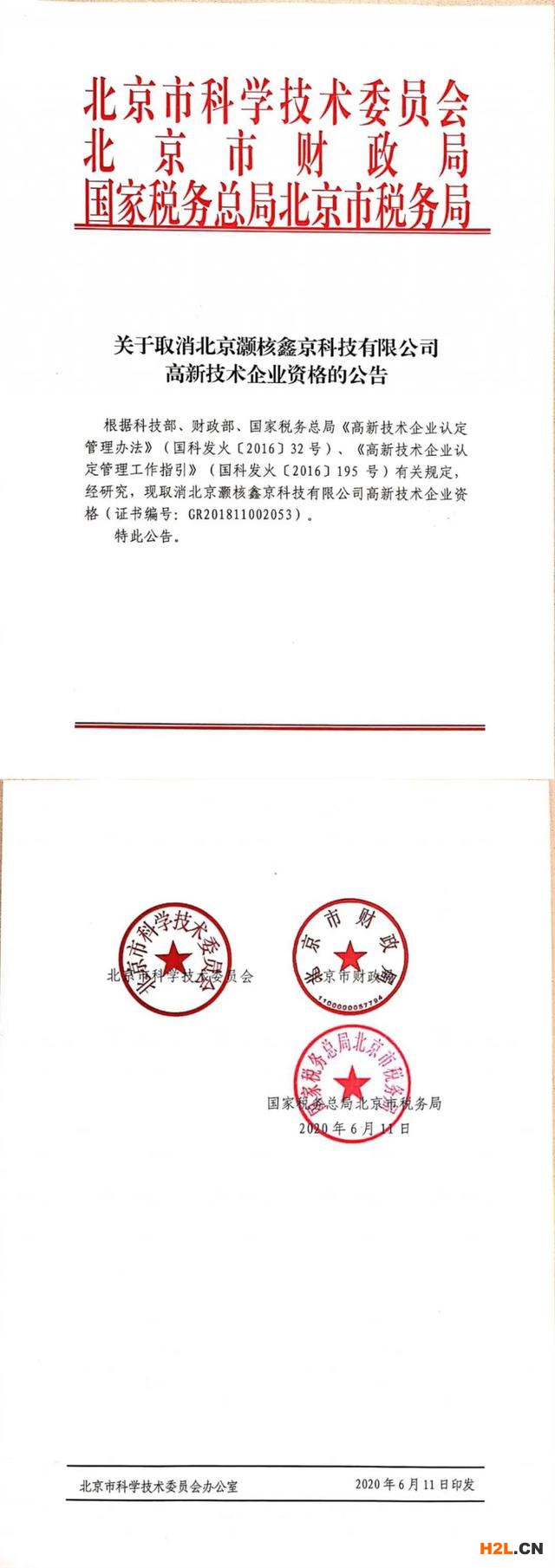 關(guān)于取消北京灝核鑫京科技有限公司高新技術(shù)企業(yè)資格的公告