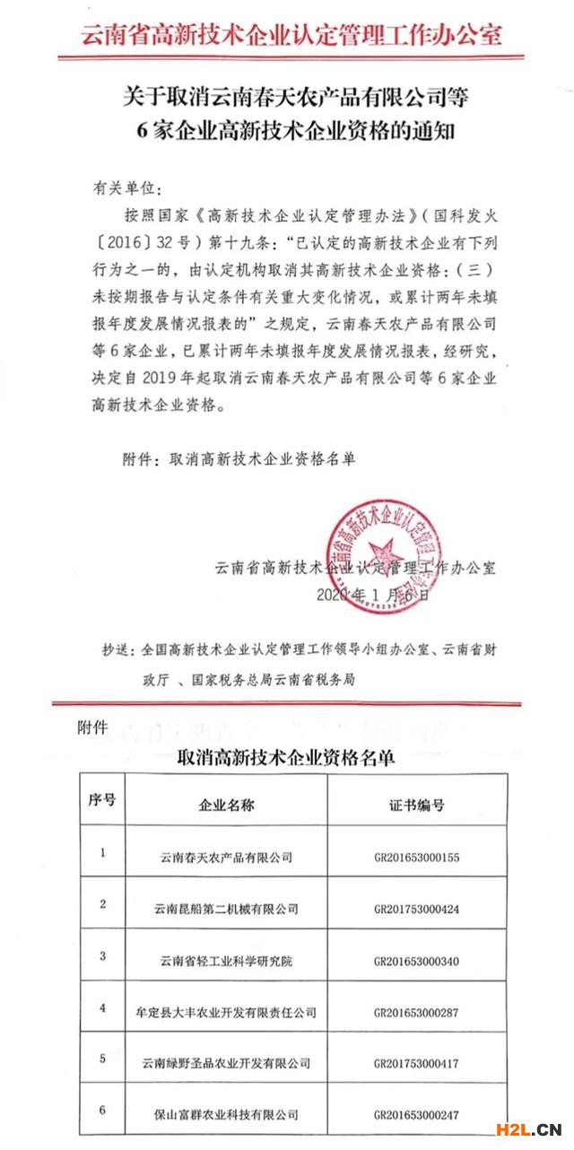關(guān)于取消云南春天農(nóng)產(chǎn)品有限公司等6家企業(yè)高新技術(shù)企業(yè)資格的通知