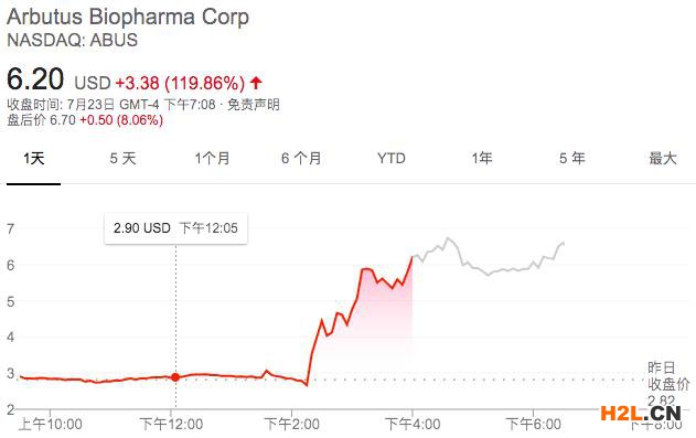 而受此消息提振,專利權(quán)人Arbutus的股價(jià)大漲近120%。