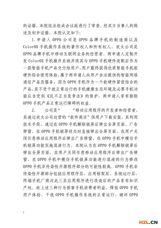 2.被申請(qǐng)人是“某某”移動(dòng)應(yīng)用程序的開發(fā)者和經(jīng)營者,其通過歡太公司運(yùn)營的“軟件商店”供用戶下載安裝,其利用技術(shù)手段,通過在OPPO手機(jī)解開鎖屏后彈出全屏頁面、廣告彈窗、在OPPO手機(jī)鎖屏狀態(tài)時(shí)直接彈出全屏頁面、在用戶關(guān)閉任意移動(dòng)應(yīng)用程序后彈出廣告彈窗、在OPPO手機(jī)中模仿手機(jī)鎖屏功能實(shí)施混淆行為。本院認(rèn)為在OPPO手機(jī)解開鎖屏后彈出全屏頁面、在用戶關(guān)閉任意移動(dòng)應(yīng)用程序后彈出廣告彈窗、在OPPO手機(jī)中模仿手機(jī)鎖屏功能進(jìn)行混淆的行為修改OPPO 手機(jī)非傳染性開源程序部分的可能性較高。OPPO 手機(jī)非傳染性開源部分包括應(yīng)用程序?qū)印?yīng)用框架層、系統(tǒng)運(yùn)行層,終端手機(jī)廠商對(duì)此三層應(yīng)用程序進(jìn)行改造后的產(chǎn)品享有知識(shí)產(chǎn)權(quán)。故上述三種行為損害手機(jī)消費(fèi)者利益、降低OPPO手機(jī)用戶體驗(yàn)、干擾OPPO手機(jī)操作系統(tǒng)的正常運(yùn)行、破壞OPPO 手機(jī)健康生態(tài)環(huán)境的可能性大,構(gòu)成不正當(dāng)競爭的可能性較高。