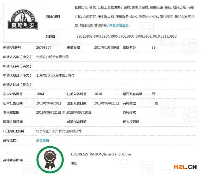 據(jù)了解2008年以來(lái)光明乳業(yè)在29類、32類等商品類別上申請(qǐng)注冊(cè)了“莫斯利安MOMCHILOVTSI及圖”商標(biāo)。
