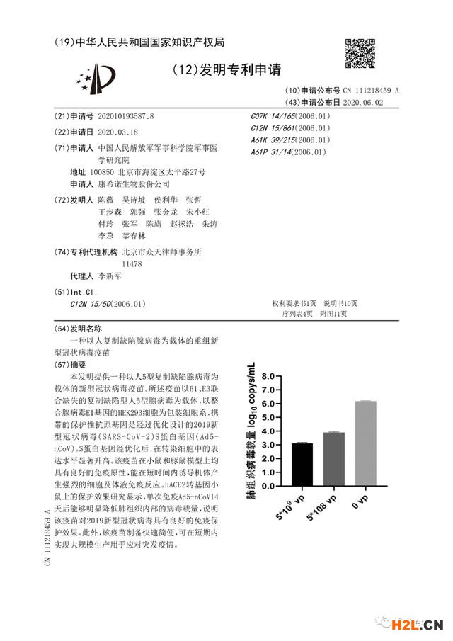 據(jù)國家知識(shí)產(chǎn)權(quán)局介紹,經(jīng)核,該疫苗專利申請(qǐng)發(fā)明名稱為“一種以人復(fù)制缺陷腺病毒為載體的重組新型冠狀病毒疫苗”,該專利申請(qǐng)?zhí)枮?02010193587.8,申請(qǐng)人為中國人民解放軍軍事科學(xué)院軍事醫(yī)學(xué)研究院和康希諾生物股份公司,發(fā)明人為陳薇等,申請(qǐng)日為2020年3月18日,經(jīng)提交優(yōu)先審查請(qǐng)求后,國家知識(shí)產(chǎn)權(quán)局于2020年8月11日發(fā)出專利授權(quán)通知書,待申請(qǐng)人依法辦理專利權(quán)登記手續(xù)后,該局將公告授權(quán)該專利。