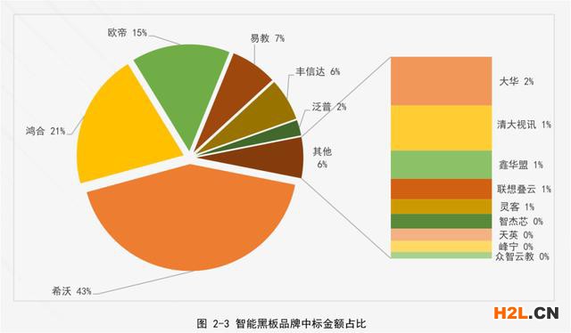 根據(jù)中國政府采購網(wǎng)自2018年以來的智能黑板中標數(shù)據(jù)顯示(剔除未知品牌市場數(shù)據(jù),共284條),如下圖所示,在政府招標采購中,中標金額前幾名分別是希沃、鴻合,歐帝、易教、豐信達和泛普。
