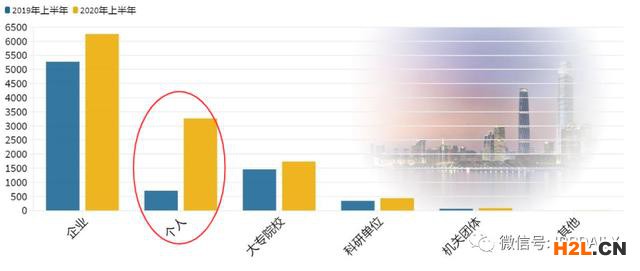 將天河區(qū)2020年上半年的專利授權(quán)量,按照不同的申請(qǐng)人類型細(xì)分。我們可以看到與去年同期數(shù)據(jù)比較,這些增量都來源于哪里。