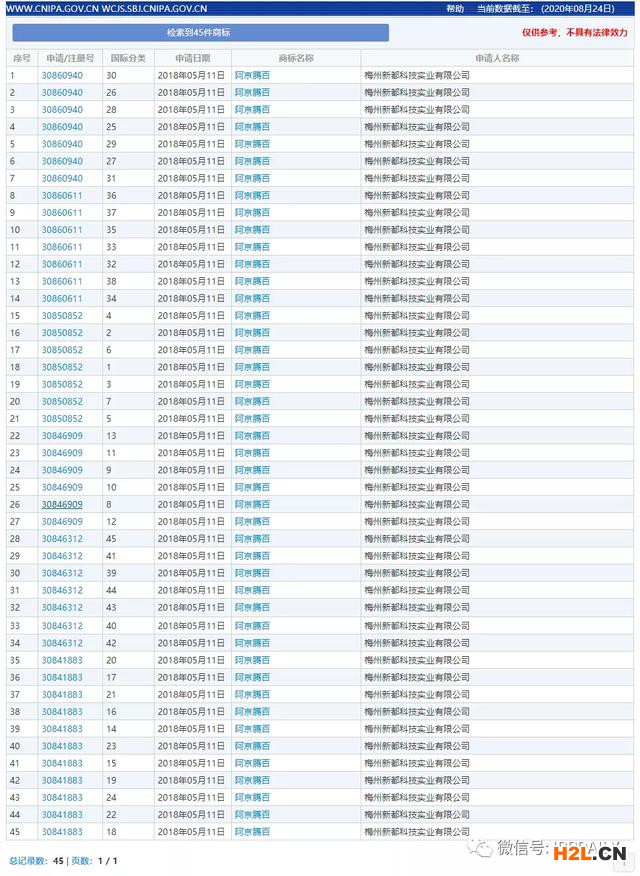 經(jīng)查詢,這45件“阿京騰百”商標(biāo)中,第一批初審公告時間為2018年11月20日。第二批初審公告時間為2018年11月27日。