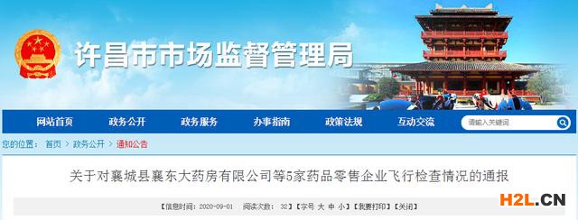 另外,據(jù)河南省許昌市市場監(jiān)督管理局網(wǎng)站消息,該局于2020年8月13日-14日對襄城縣襄東大藥房有限公司等5家藥品零售企業(yè)進行了飛行檢查。針對本次檢查中發(fā)現(xiàn)的問題,轄區(qū)局已依法進行處理。