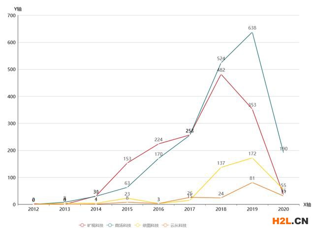 商湯科技、曠視科技、云從科技、依圖科技被稱為內(nèi)地“AI四小龍”,這四家企業(yè)均以AI領(lǐng)域計算機(jī)視覺技術(shù)起家,深耕AI技術(shù)在各領(lǐng)域的落地應(yīng)用。本文就技術(shù)落地應(yīng)用、專利布局進(jìn)行對比。
