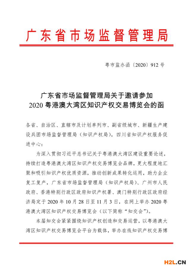 廣東省市場(chǎng)監(jiān)督管理局關(guān)于邀請(qǐng)參加2020粵港澳大灣區(qū)知識(shí)產(chǎn)權(quán)交易博覽會(huì)的函