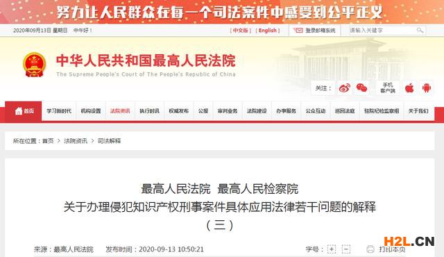 《最高人民法院、最高人民檢察院關(guān)于辦理侵犯知識產(chǎn)權(quán)刑事案件具體應(yīng)用法律若干問題的解釋(三)》已于2020年8月31日最高人民法院審判委員會第1811次會議、2020年8月21日最高人民檢察院第十三屆檢察委員會第四十八次會議通過,現(xiàn)予公布,自2020年9月14日起施行。