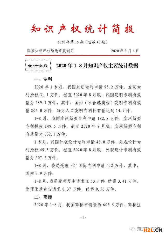 2020年1-8月專利、商標(biāo)、地理標(biāo)志等知識產(chǎn)權(quán)主要統(tǒng)計數(shù)據(jù)