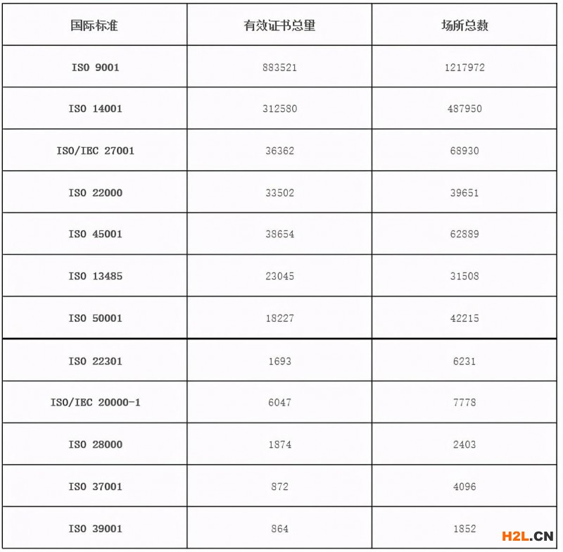 下表顯示了調(diào)查所涉及的每個標準的有效證書總量及其涵蓋的場所總數(shù)。每個標準更詳細的結(jié)果可參見ISO網(wǎng)站。對于每個標準,證書數(shù)量和場所數(shù)量并列顯示,以便于更全面的了解情況。證書是認證機構(gòu)在客戶證實其標準符合性后所簽發(fā)的文件,場所是組織開展工作或服務的永久性處所。