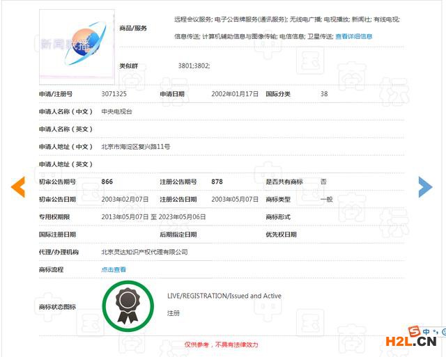 據(jù)商標(biāo)局網(wǎng)站查詢得知,中央電視臺于2002年1月17日申請注冊了6件“新聞聯(lián)播”圖文商標(biāo),涉及6個(gè)類別。