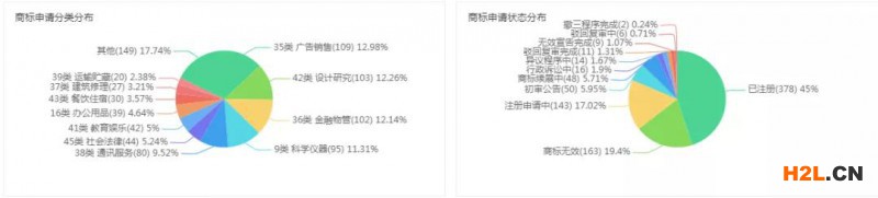 商標(biāo)申請(qǐng)分布在各個(gè)類(lèi)別,其中45%的商標(biāo)已經(jīng)申請(qǐng)成功。