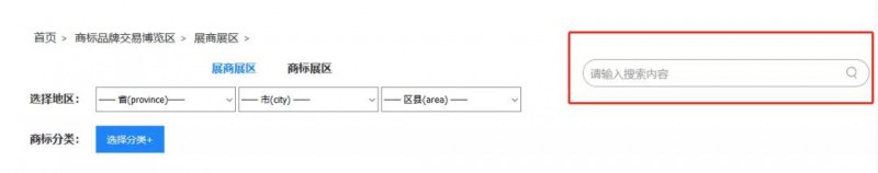 2、點(diǎn)擊“展商展區(qū)”即可查看所有展商信息。該頁面中可選擇填入省、市、區(qū)縣等詳細(xì)信息,通過地域快速查找目標(biāo)展商,精準(zhǔn)定位。同時(shí),商標(biāo)分類處可選擇具體分類,查找自己感興趣的領(lǐng)域以便搜索。