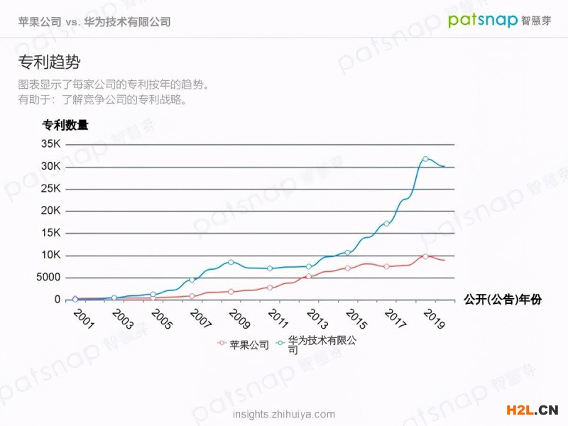 從專利趨勢(shì)的維度也可以看出,蘋果專利公開(公告)數(shù)量的年增長是一條比較平緩的上升曲線,而華為的專利總量自2003年超過蘋果后,從2013年開始,其增長曲線被陡然拉直,后來居上不說,還逐漸甩開了與蘋果的差距。