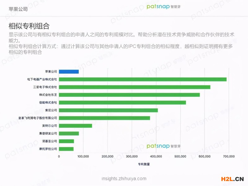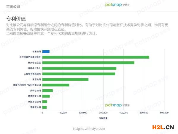 其二是,從蘋果與競(jìng)爭公司的相似專利組合、專利價(jià)值、專利年趨勢(shì)、專利地域趨勢(shì)等多個(gè)維度進(jìn)行對(duì)比,除了華為之外,韓國的三星、日本的松下、東芝、佳能、索尼等公司的表現(xiàn)均優(yōu)于蘋果。