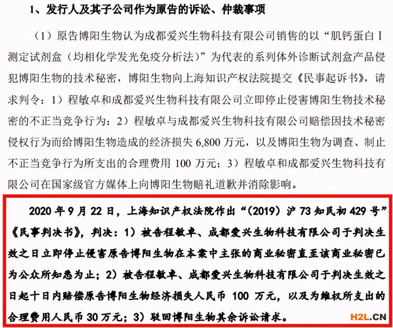 根據(jù)10月15日科美診斷IPO審核階段更新的最新信息顯示,上海知識產(chǎn)權(quán)法院在9月22日作出本案的《民事判決書》,判決:(1)程敏卓、愛興生物停止侵害博陽生物(注:已被科美診斷收購)的技術(shù)秘密;(2)賠償經(jīng)濟損失100萬元,及合理維權(quán)支出30萬元;(3)駁回其余訴訟請求。