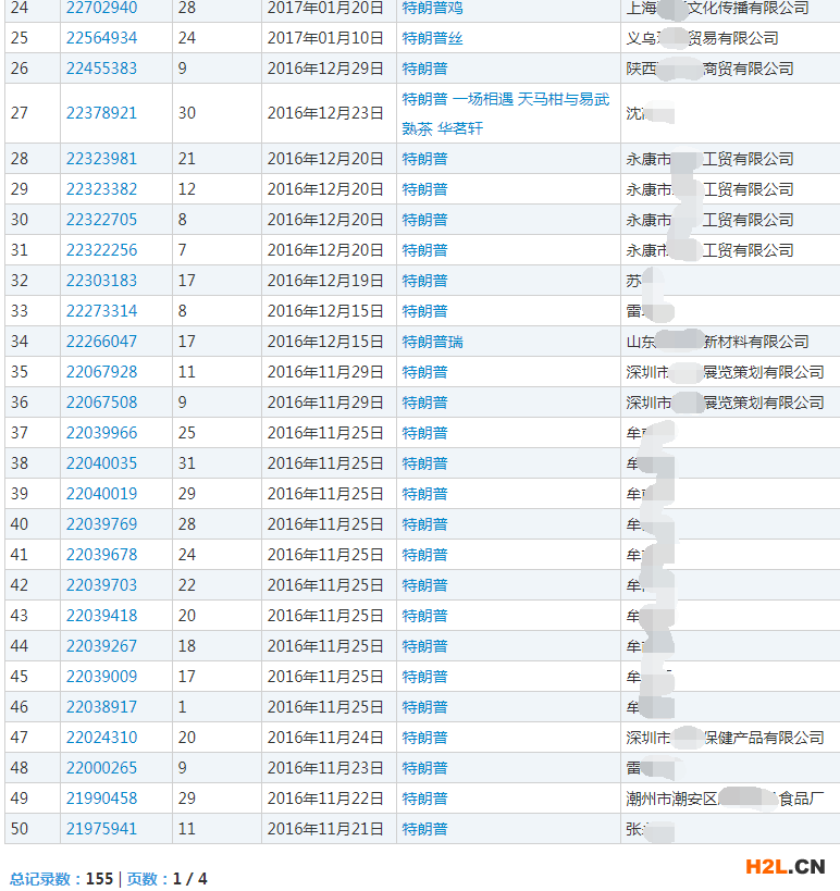 還別說,申請注冊與特朗普相關商標的中國企業(yè)或個體經營戶還挺不少的。目前包括特朗普自己在中國成立的公司在內,總共有155件商標注冊記錄。