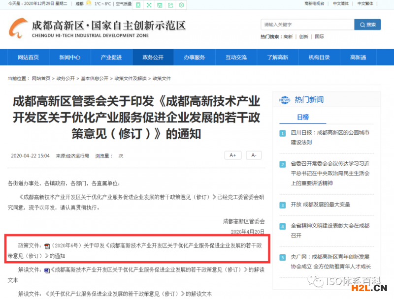 核心提示:成都高新區(qū)政府強勢補助20萬元獎勵ISO50001能源體系認證和ISO45001職業(yè)健康安全體系認證企業(yè)?成都高新區(qū)管委會關于印發(fā)《成都高新技術產(chǎn)業(yè)