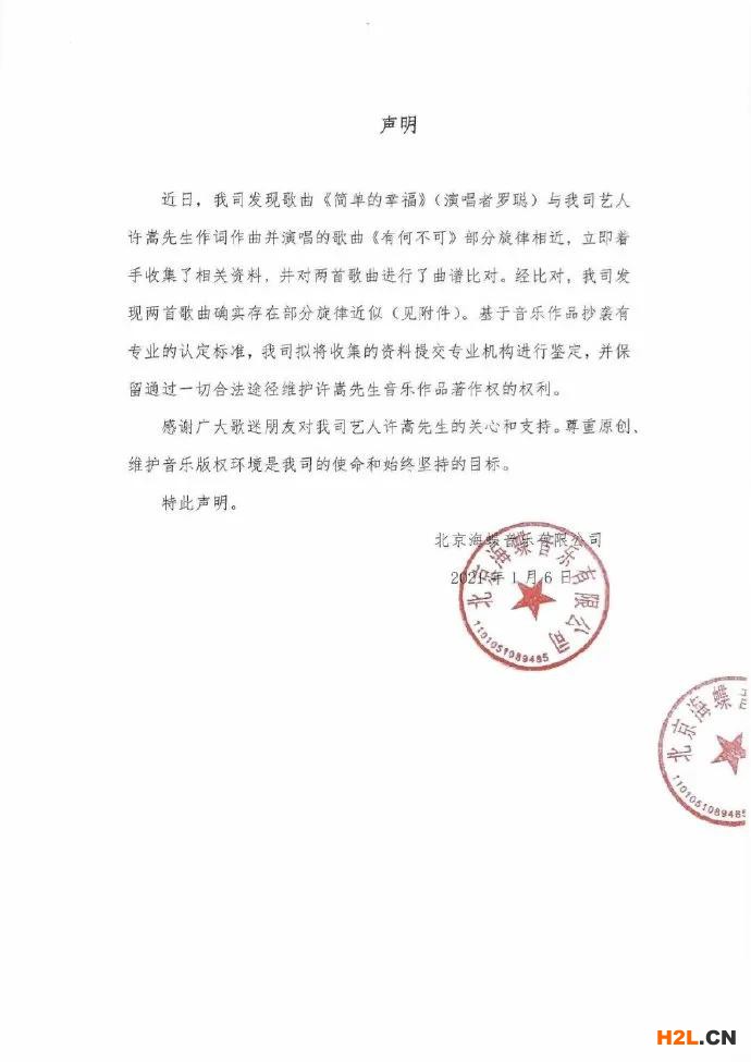 1月6日,孔雀音樂在微博發(fā)布聲明,否認(rèn)所屬藝人羅聰?shù)母枨u許嵩十一年前的大熱歌曲《有何不可》,表示:“《簡單的幸福》不存在抄襲!如此后再有刻意捏造事實,惡意中傷我公司及羅聰,侵犯了我公司及羅聰?shù)拿u(yù)權(quán),對此行為本公司保留追究其法律責(zé)任的權(quán)利!”并附上兩首歌的簡譜對比。