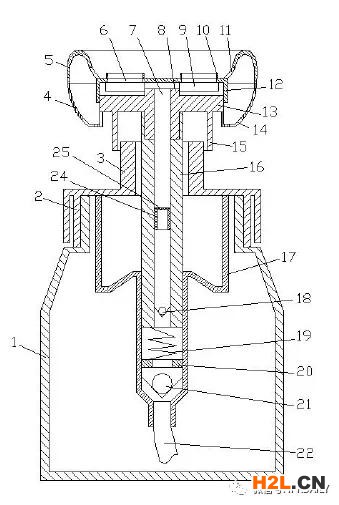該專利產(chǎn)品在使用時(shí),將洗手液盛放于盒體1內(nèi),需要洗手液時(shí),單手手掌對(duì)按壓環(huán)5進(jìn)行按壓,出液管16帶動(dòng)單向閥I18向下移動(dòng),彈簧19被壓縮,兩單向閥之間的空間變小,壓力增大,使單向閥I18被打開,允許洗手液通過,洗手液經(jīng)過發(fā)泡網(wǎng)25后形成泡沫狀,泡沫向上移動(dòng)并經(jīng)分液孔6噴至手掌上,手掌離開按壓環(huán)5時(shí),在彈簧19的作用下,出液管16上移,兩單向閥之間的空間變大,單向閥II21被打開,盒體1內(nèi)的洗手液被吸入至兩單向閥之間,完成洗手液吸入。在第一次使用時(shí),可先進(jìn)行多次按壓,使洗手液和泡沫充滿于出液管16內(nèi)。該洗手液存放裝置打破了傳統(tǒng)的洗手液從側(cè)方噴出的結(jié)構(gòu)形式,使洗手液從上方噴出至手掌,單手即可穩(wěn)定完成洗手液的按壓出,操作更加方便。