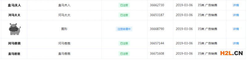 湖南每日三果貿(mào)易有限公司不僅申請了“盒馬夫人”、“盒馬爸爸”,還申請了“河馬太太”、“河馬夫人”,大部分都已申請成功。