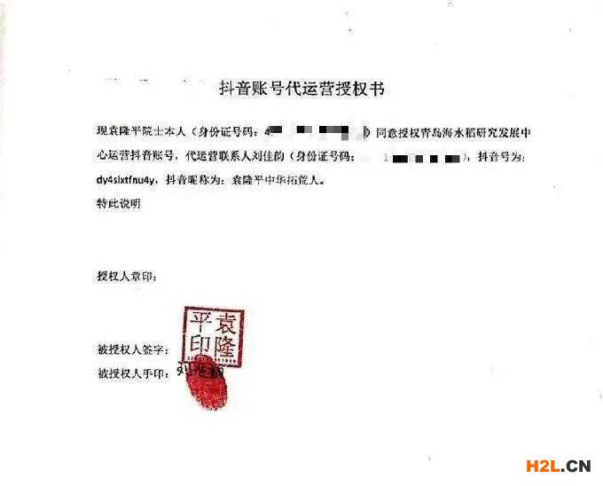 抖音在說明中還附上了有袁隆平簽字印的抖音賬號代運營授權(quán)書。