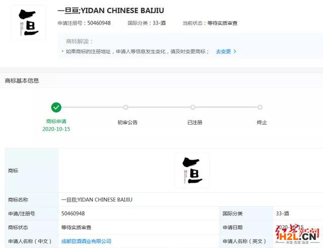 記者注意到,成都一家名為“成都亙酒酒業(yè)有限公司”的企業(yè)去年10月提交了一份商標(biāo)申請(qǐng),商標(biāo)名稱為“一旦亙;YIDAN CHINESE BAIJIU”。