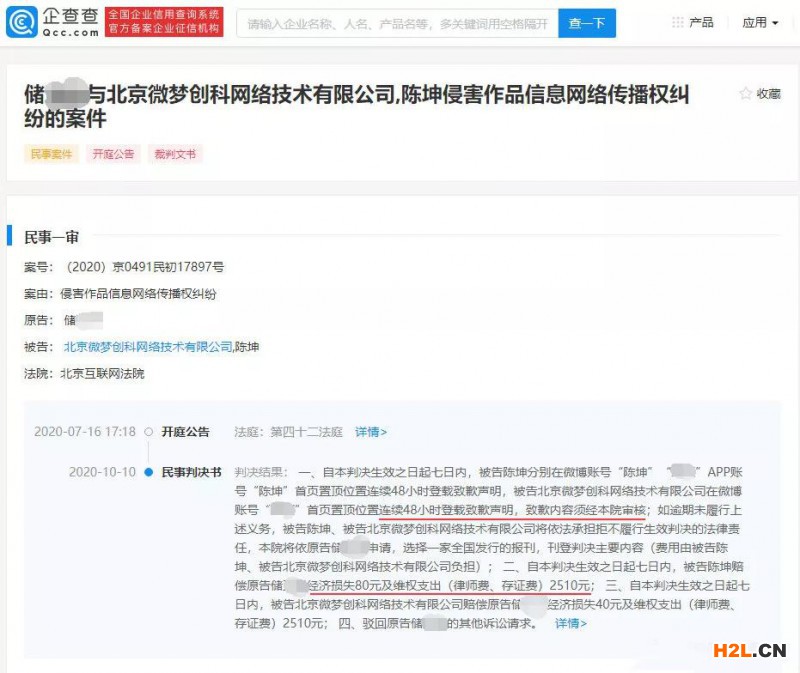 據(jù)企查查顯示,陳坤被判圖片侵權(quán),判決書已經(jīng)在1月15發(fā)布,要求陳坤在社交平臺(tái)上刊登道歉聲明,賠償經(jīng)濟(jì)損失80元以及維權(quán)支出(律師費(fèi)、存證費(fèi))2510元。