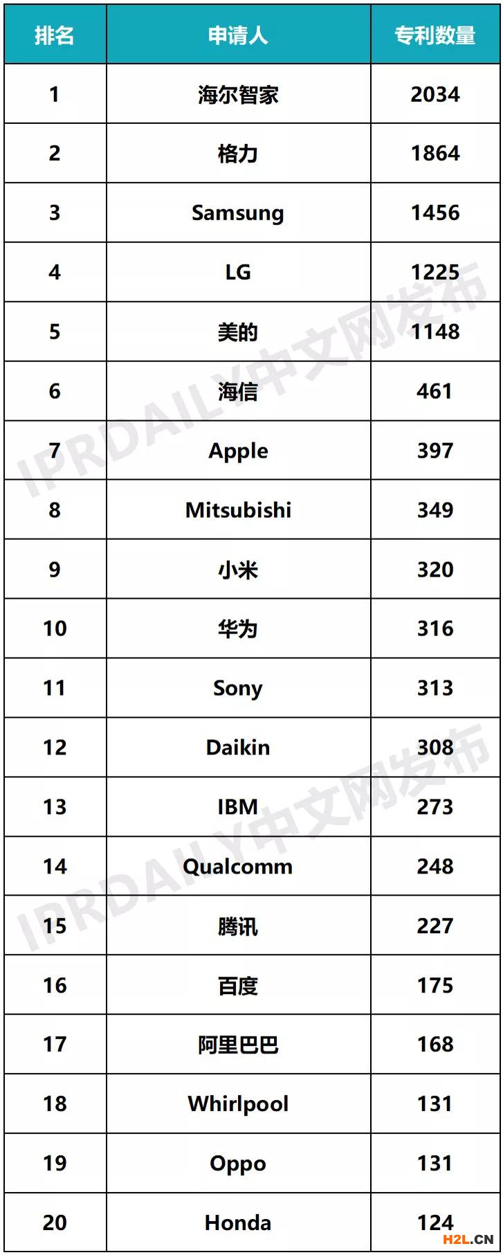 根據(jù)榜單,中國(guó)申請(qǐng)人約占總申請(qǐng)人數(shù)量的1/3;擁有千件級(jí)別專利申請(qǐng)量的申請(qǐng)人共有5家,分別是海爾智家、格力、Samsung、LG和美的,而其中只有海爾智家的數(shù)量在2000件以上。