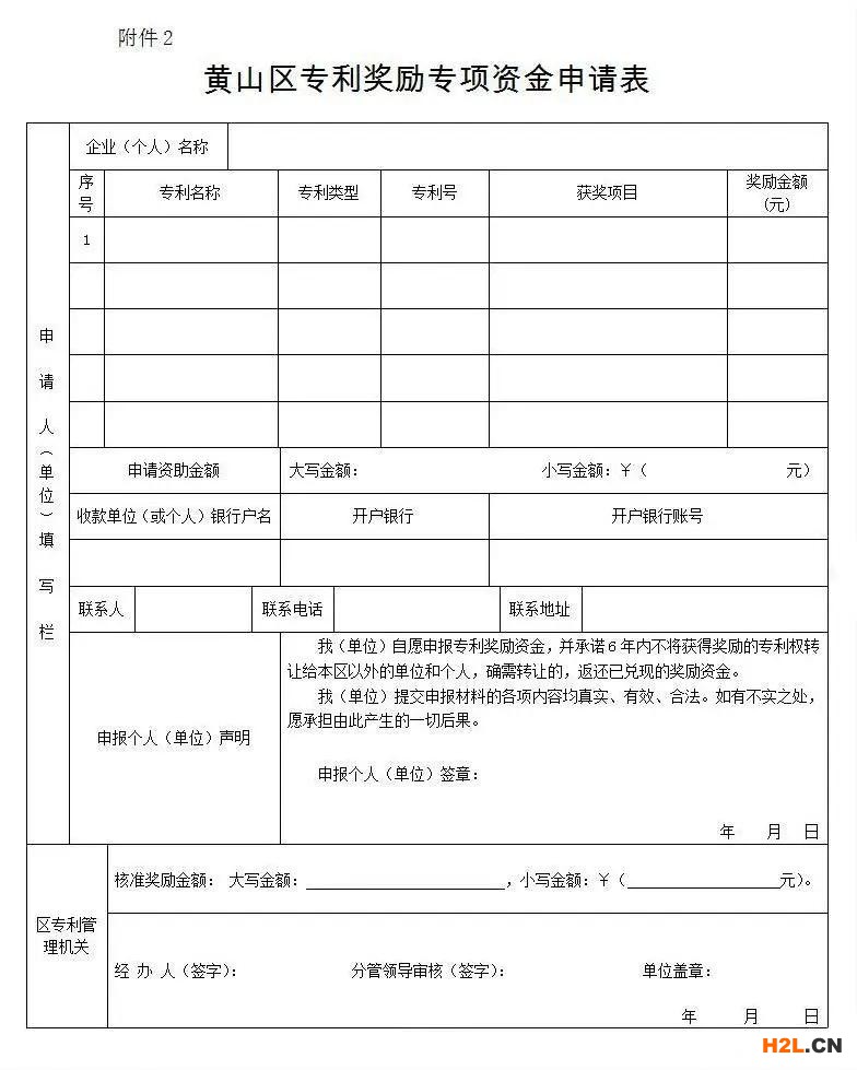1、黃山區(qū)專利獎(jiǎng)勵(lì)專項(xiàng)資金申請(qǐng)表(附件2);