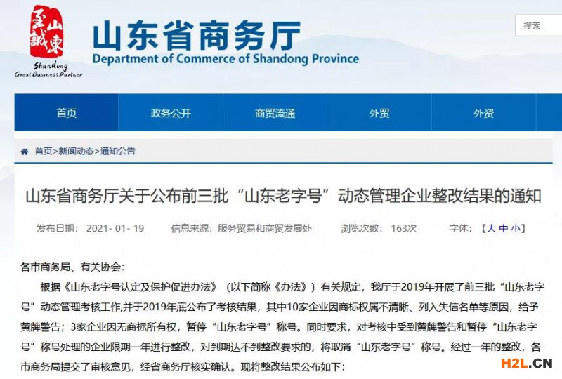 據(jù)了解,從2019年起,山東省商務(wù)廳開展了前三批“山東老字號”動態(tài)管理考核工作,并于2019年底公布了考核結(jié)果,其中10家企業(yè)因商標(biāo)權(quán)屬不清晰、列入失信名單等原因,給予黃牌警告;3家企業(yè)因無商標(biāo)所有權(quán),暫停“山東老字號”稱號。同時要求,對考核中受到黃牌警告和暫停“山東老字號”稱號處理的企業(yè)限期一年進(jìn)行整改,對到期達(dá)不到整改要求的,將取消“山東老字號”稱號。
