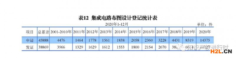 2020年,我國集成電路布圖設(shè)計(jì)登記申請14375件, 發(fā)證11727件。