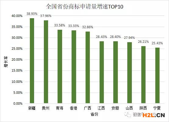 從商標(biāo)申請(qǐng)量增速看,新疆、貴州、青海、香港、廣西五個(gè)省份占據(jù)申請(qǐng)量增速前5。