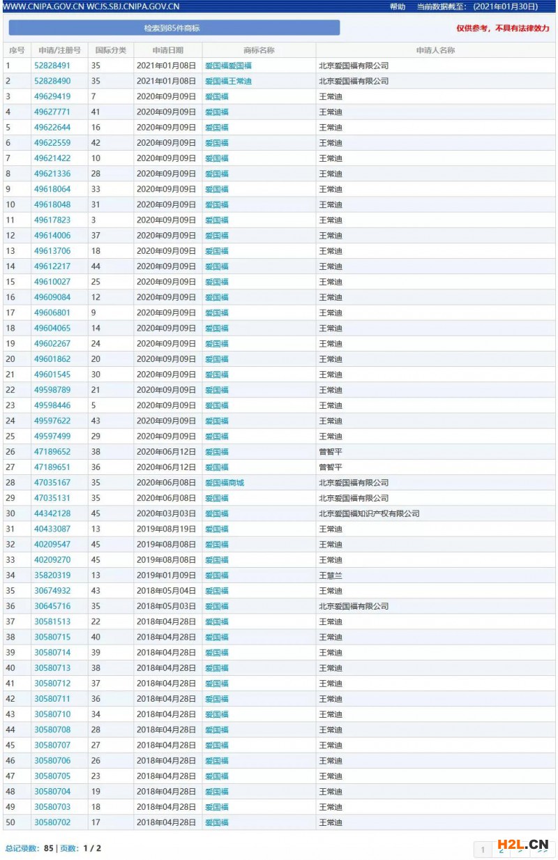 據(jù)商標(biāo)網(wǎng)查詢可知,截止2021年1月30日,共有85件“愛國(guó)福”商標(biāo)的申請(qǐng),申請(qǐng)類別為第35、7、41等,最早申請(qǐng)時(shí)間為2016年2月29日。申請(qǐng)人中并沒有支付寶或者阿里巴巴等公司。