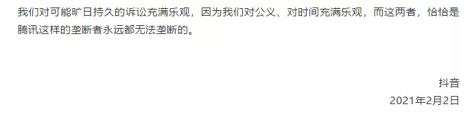 對于抖音起訴騰訊壟斷一事,2月2日,騰訊通過鵝廠黑板報官方微信號回應(yīng):我司暫未收到關(guān)于抖音起訴我司的相關(guān)材料。
