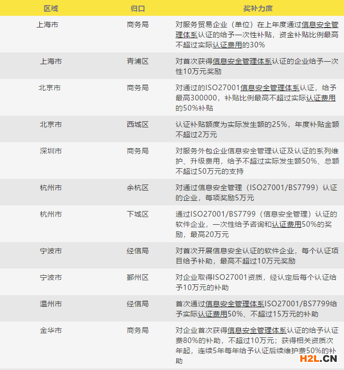 ISO27001信息安全管理體系是組織進行信息安全管理的重要管理依據(jù),目前全國各地市為推進屬區(qū)企業(yè)信息化建設(shè),加強信息安全管理,促進企業(yè)高質(zhì)量發(fā)展,分別出臺了相應(yīng)的獎補措施,中鴻認證服務(wù)現(xiàn)將各地2021年現(xiàn)行的 ISO27001信息安全管理體系認證獎勵補貼政策整理給各位,供參考。