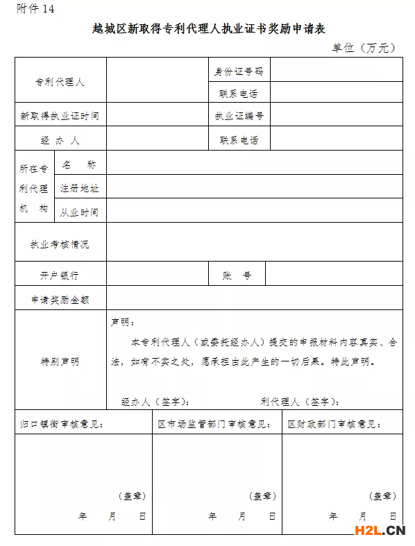 (1)越城區(qū)新取得專利代理人執(zhí)業(yè)證書獎勵申請表(附件14);
