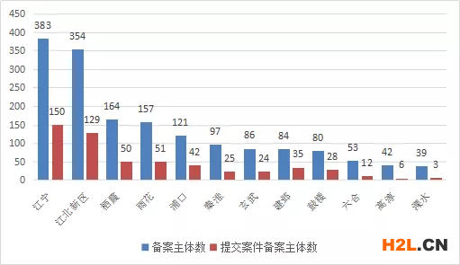 截至2020年12月31日,江寧區(qū)、江北新區(qū)和棲霞區(qū)備案主體數(shù)量分別以382家、354家、164家排名前三名,前三名區(qū)域備案主體數(shù)量占備案主體總數(shù)量的54.28%;但是江寧區(qū)、江北新區(qū)和棲霞區(qū)“備案主體活躍指數(shù)”(指在南京保護(hù)中心提交過專利預(yù)審案件的備案主體數(shù)占備案主體總數(shù)比率)分別僅有27.03%、23.24%、9.01%。