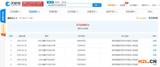 天眼查App顯示,濰坊瑞馳公司全稱為濰坊瑞馳汽車系統(tǒng)有限公司,該公司成立于2010年6月,注冊(cè)資本約2.42億元人民幣,法定代表人為徐銀光,經(jīng)營(yíng)范圍含新能源車整車制造、新能源汽車系統(tǒng)及零部件制造銷售;汽車的設(shè)計(jì)與研發(fā)等。值得注意的是,天眼查App顯示,該公司此前已有多條被執(zhí)行人信息,執(zhí)行法院均為濰坊濱海經(jīng)濟(jì)技術(shù)開(kāi)發(fā)區(qū)人民法院,其中最新立案日期為2021年3月3日,執(zhí)行標(biāo)的為108萬(wàn),截至目前,該公司被執(zhí)行總金額已超571萬(wàn)元。